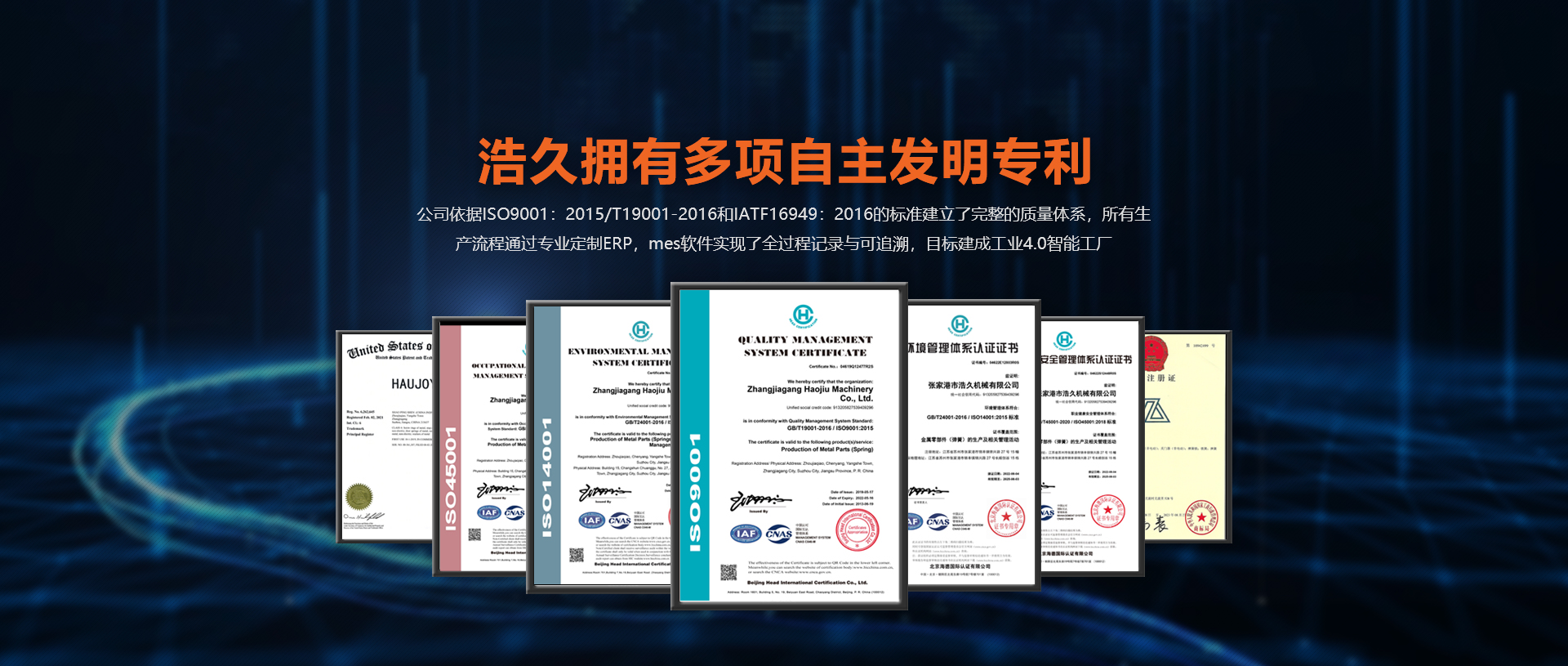 浩久擁有多項自主發(fā)明專利。公司依據ISO9001GB/T19001-2016和IATF:2016的標準建立了完整的質量體系,所有生產流程通過專業(yè)定制ERP,mes軟件實現了全過程記錄與可追溯,目標建成工業(yè)4.0智能工廠。